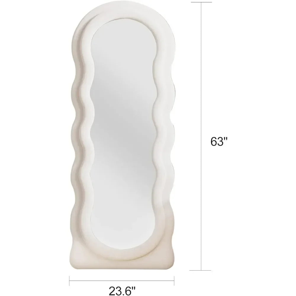 Arched wavy full-length mirror with flannel frame.